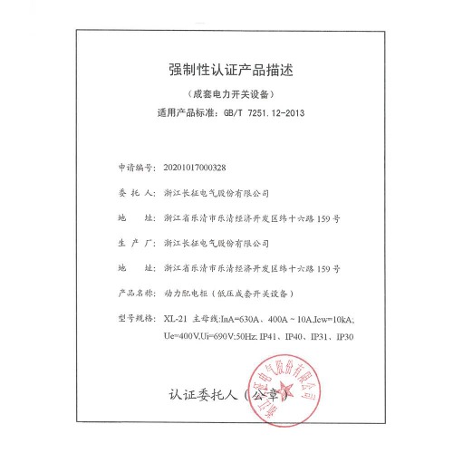 XL-21动力配电柜(低压成套开关设备)强制性认证产品描述