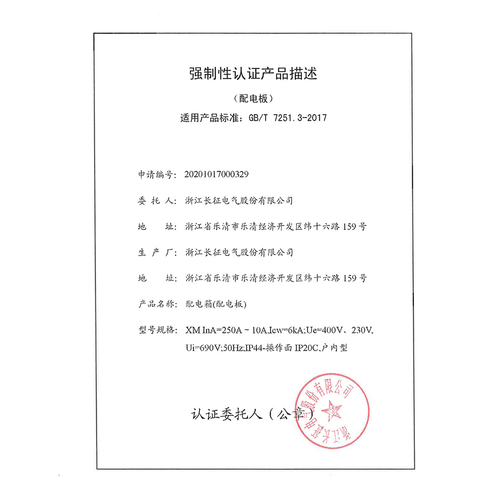 XM 250-10A配电箱强制性认证产品描述