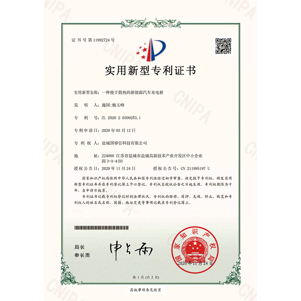 一种便于散热的新能源汽车充电桩 实用新型专利证书