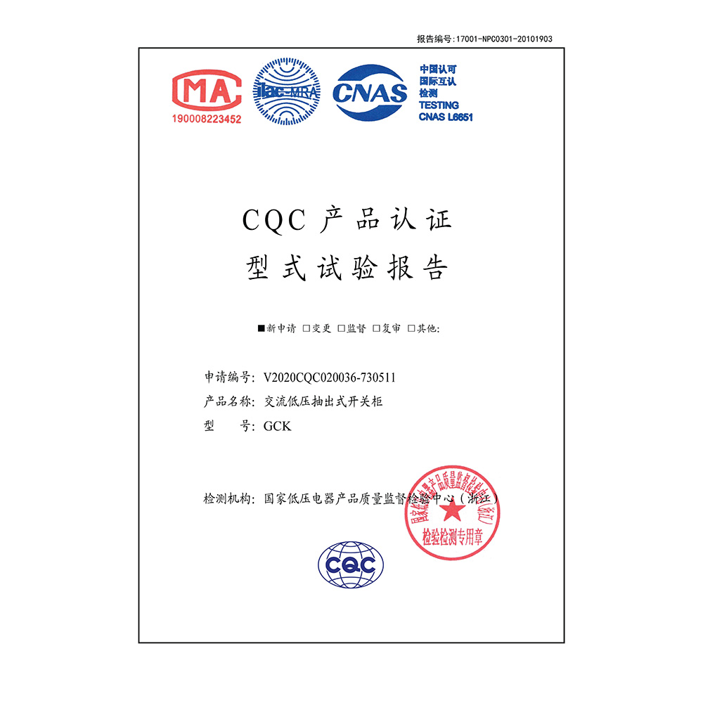 GCK(400A~1600A)交流低压抽出式开关柜 CQC型式试验报告