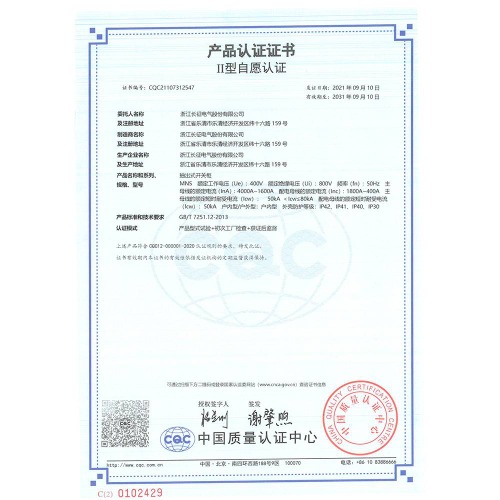 MNS抽出式开关柜 产品认证证书