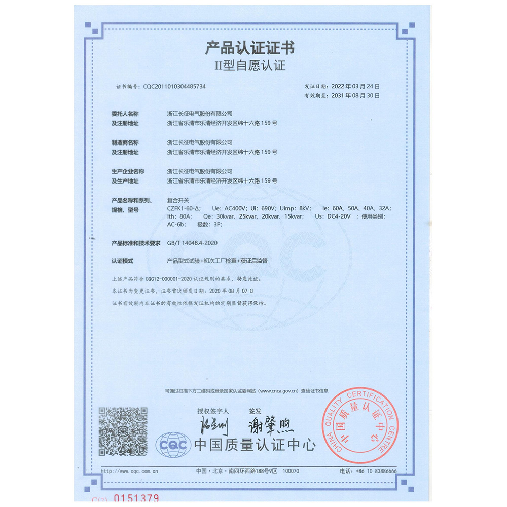 CZFK1-60-△复合开关 产品认证证书