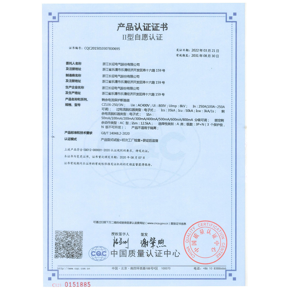 CZLE6-250/3N剩余电流保护断路器 产品认证证书