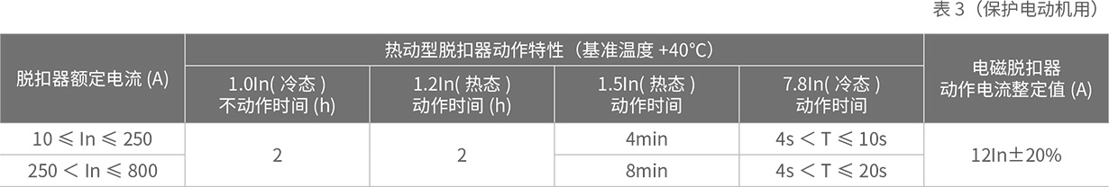 断路器热动型脱扣器具有反时限特性,电磁脱扣器为瞬时动作,特性见表 2、表 3