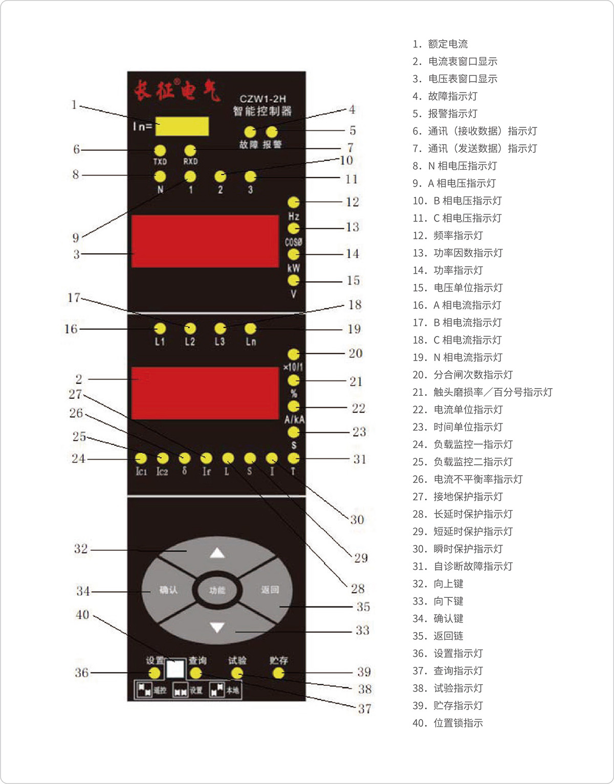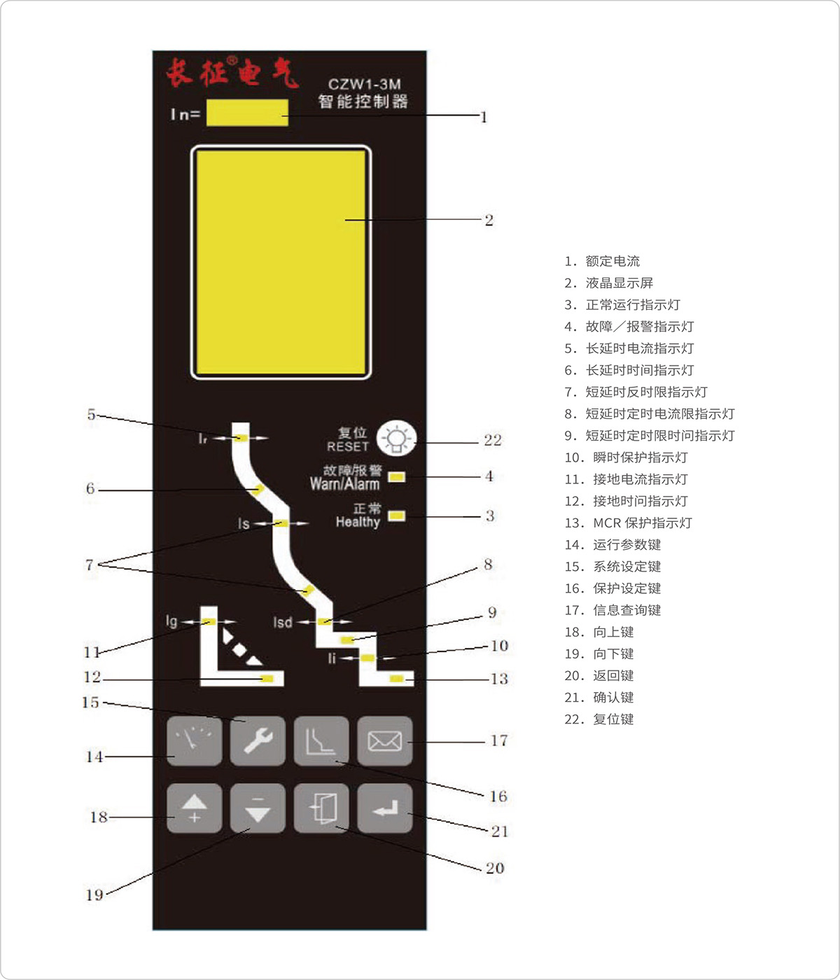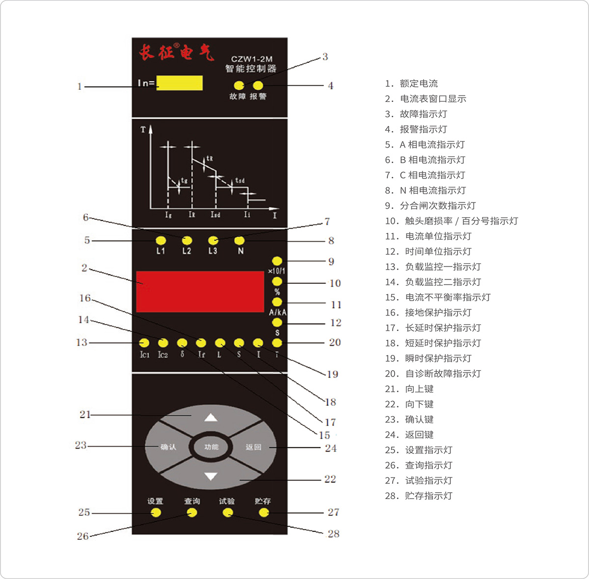 断路器遇故障分断后,智能控制器能显示出故障类别、故障相序及故障电流值、分断动作时间值。