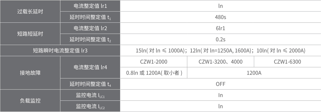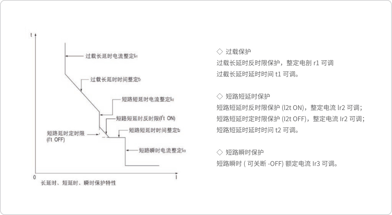 在低倍数电流时为反时限特性:当过载电流大于 8lr1 时自动转换为定时限特性。短延时 l2t 特性可“OFF”.此时呈定时限特性。