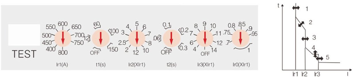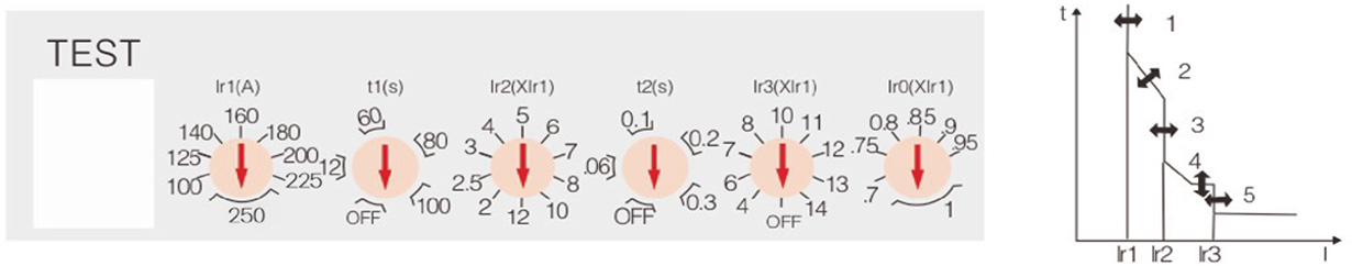 1、过载长延时动作电流 Ir1 调整根据断路器不同的额定电流可从 4 档到 10 档进行调整;